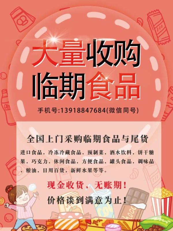 手机号:13918847684(微信同号),全国上门采购临期食品与尾货【进口食品,冷冻冷藏食品,鸡鸭牛羊肉,面点,预制菜,酒水饮料,饼干糖果,巧克力,休闲食品,方便食品,罐头食品,调味品,粮油,日用百货,新鲜水果】,现金收货,无账期!价格谈到满意为止! 收购临期食品与尾货